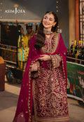 Embody the brilliance of this magenta ensemble, mirroring the captivating vibrancy of a dew-kissed petunia. The shirt unfolds like a canvas adorned with extravagant beige embroidery, each stitch a brushstroke of elegance. Light gold zari and sequins dance upon the surface, like constellations caught in the fabric's weave. An embroidered dupatta, a shawl of splendor, drapes over the ensemble, transforming it into the luminous embodiment of a star.