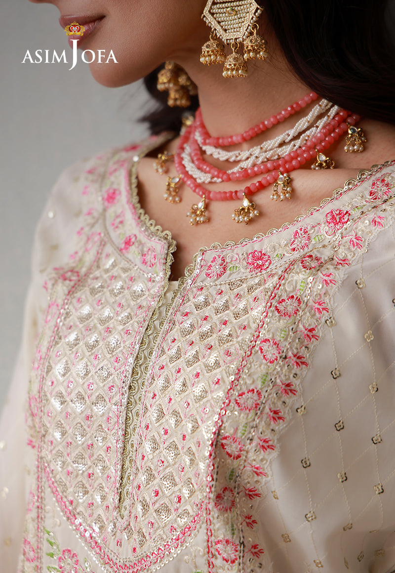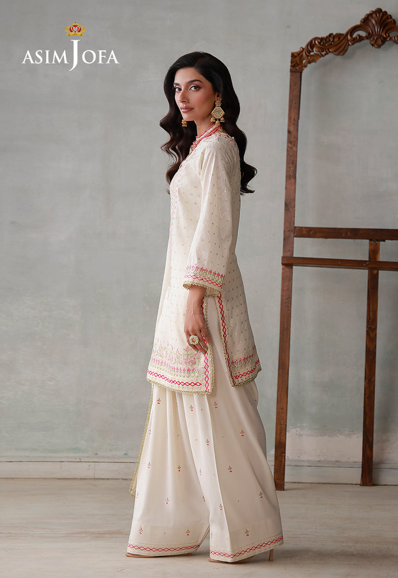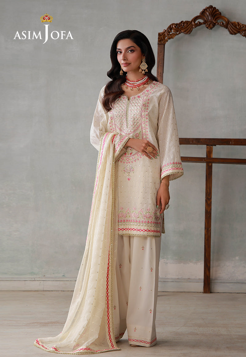 Bathed in understated elegance, this off-white ensemble unfolds with a refined, luminous allure. The shirt is exquisitely adorned with pastel-toned embroidery, delicately set against the pristine canvas to create a soft yet captivating contrast. Perfectly complemented by impeccably tailored trousers detailed with graceful embroidery, the look is completed with a whisper-light embroidered dupatta. Together, the ensemble embodies timeless sophistication, making it an irresistible choice for festive occasions.