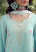 A breath of freshness woven into festive couture. This aqua creation is adorned with contrasting threadwork and delicate natural motifs that scatter gracefully across the shirt like a flourishing garden. Light, refreshing, and effortlessly radiant, the design captures the spirit of summer elegance. Paired with a beautifully printed chiffon dupatta, the ensemble exudes airy sophistication making it an ideal choice for sunlit Eid gatherings and joyful celebrations.