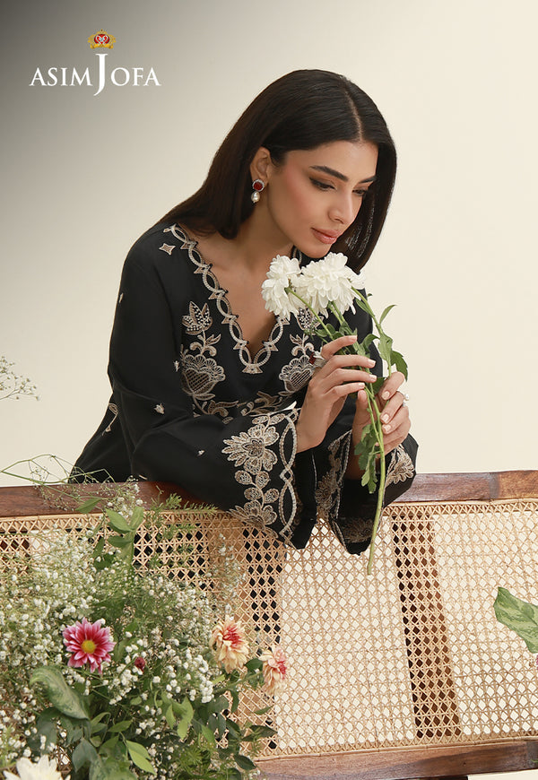 A study in contrast and craft, this black ensemble reinvents monochrome with artistic depth. The inky base becomes a dramatic backdrop for off-white and beige threadwork, where florals bloom amid whimsical bees and scattered stars. The interplay feels like a hand-drawn garden etched onto a midnight canvas. Scalloped borders lend a subtle softness to the structured aesthetic, while plain trousers ensure the embroidery remains the focal point.