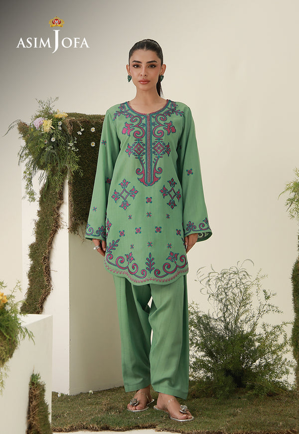 Rooted in heritage yet styled for today, this green ensemble celebrates cultural artistry through striking motifs that grace the front with presence and poise. The design feels expressive yet balanced, offering visual impact without excess. Scalloped detailing along the hem adds a refined contour, framing the silhouette with subtle ornamentation. Paired with plain trousers, it delivers a look that honors tradition with contemporary ease.