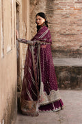 A deep plum ensemble rich with antique-gold embroidery, this look blends heritage craft with quiet grandeur. The long, open-front shirt is adorned with intricate florals and architectural motifs, while the sharara beneath adds movement and volume through its sweeping, heavily worked panels. A sheer, scalloped dupatta drapes fluidly at the side, catching the soft light with every shift. Refined, structured, and timeless — it carries the poise of old-world elegance with modern clarity.