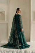 This regal emerald green ensemble is a masterpiece of timeless elegance, crafted on delicate net fabric and intricately adorned with silver and gold embroidery that shimmers with opulent charm. The structured front-open silhouette flows gracefully into a flared hemline, while the sheer embroidered sleeves enhance its ethereal sophistication. Paired with a coordinating dupatta finished with ornate embellishments, this ensemble is perfect for weddings and grand festive occasions.