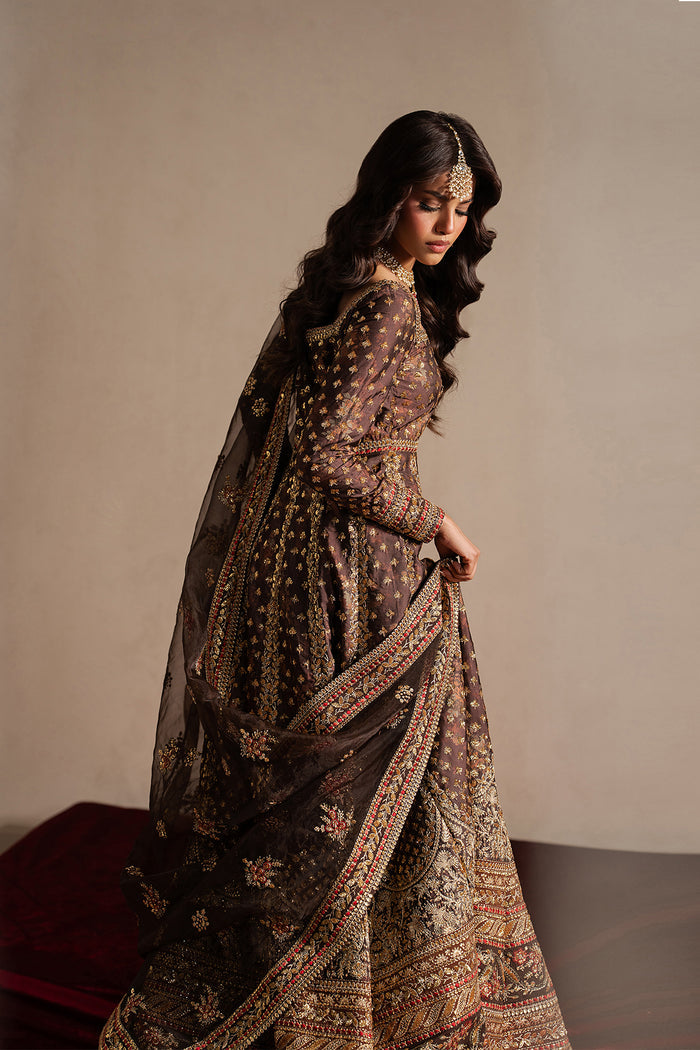 An opulent vision in rich, decadent hues, this ensemble captures the essence of timeless festivity and refined glamour. The heavily embellished silhouette is adorned with intricate gold embroidery that glimmers across the fabric, creating a striking interplay of texture and depth. Ornate detailing along the neckline, bodice, and flowing panels enhances the structured yet graceful form, while delicate accents of crimson threadwork introduce a regal contrast. The sheer dupatta cascades with dramatic elegance, framed with elaborate borders that amplify its luxurious appeal. Designed for moments that call for grandeur and confidence, this look embodies heritage craftsmanship blended with contemporary sophistication.