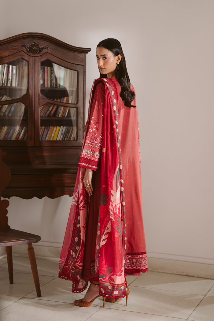 Paired with matching trousers, a sheer dupatta drapes effortlessly at the side, printed and embroidered in coordinating tones for added richness.