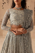 Intricately designed organza choli in the shades of ice grey features composed embroidery at front, back, and sleeves with silver colored adda work on it. Tissue lining is added underneath. To elevate the whole look, the waistline and sleeves are scallop finished, adorned with pearl and crystal hangings.