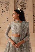 Paired with a heavily embroidered lehnga made from our luxurious organza. Artfully composed panels at front and back unveil a meticulous display of heavy adda work. Further enhanced with one shade darker embellished borders all around. Details feature a blend of resham, dabka, naqshi, crystals, and more. Striking details display a finely embroidered belt at waist. This cascading lehnga comes with an attached can can and silver tissue lining.