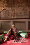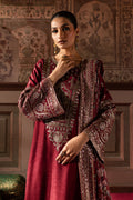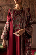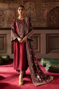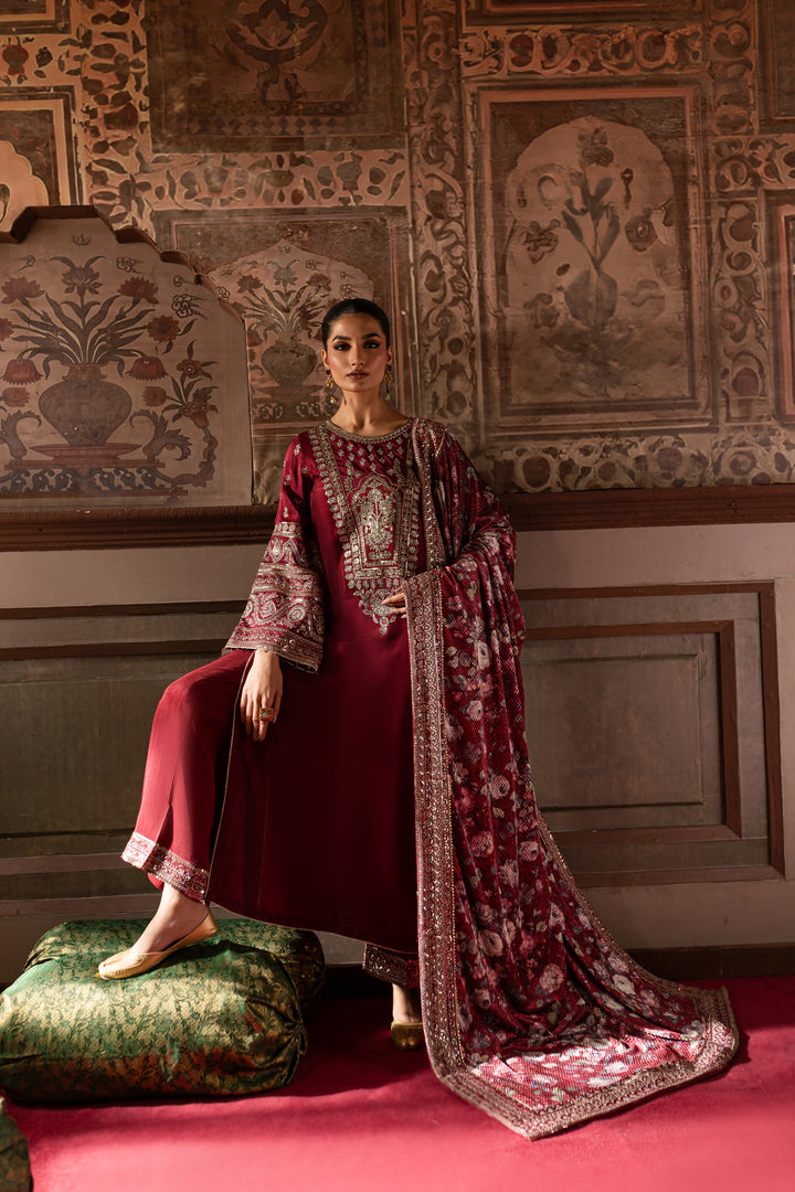 To complete this elegant outfit, a maroon printed velvet shawl featuring intricate embroidery on all borders.