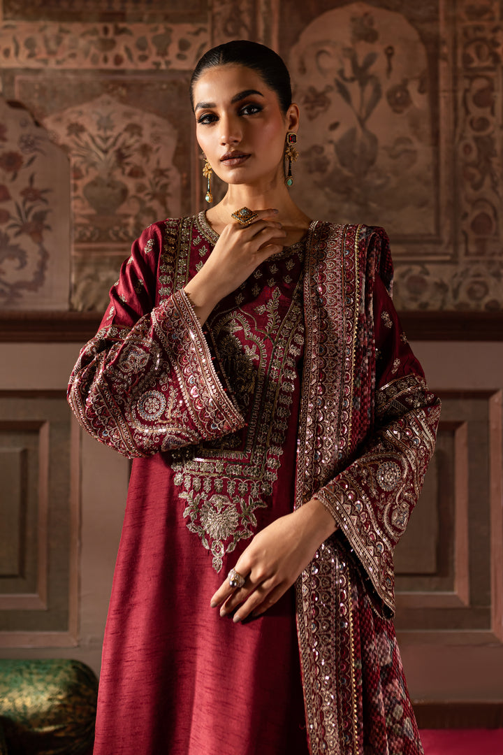 This luxurious maroon raw silk shirt, is adorned with exquisite embroidery. The shirt showcases a beautifully embroidered neckline, while the heavily embroidered sleeves create a striking and eye-grabbing look.