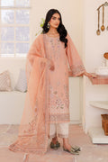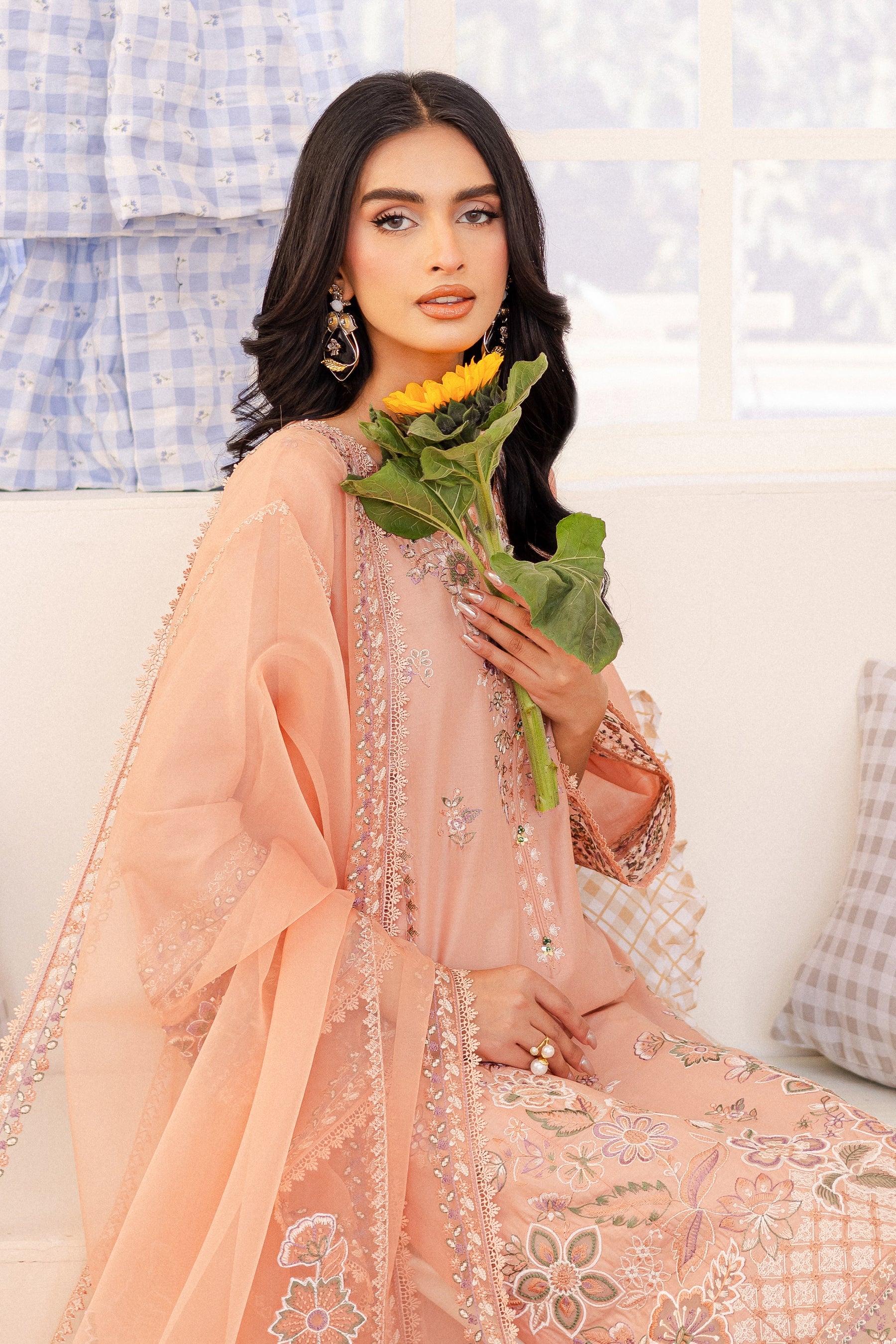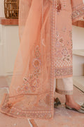 The 3-piece dress features a heavy embroidered paneled shirt, adorned with applique floral embroidery at the hem and intricate floral spreads that create a captivating design. The embroidered neckline is complemented with organza borders and crochet lace at the hem, adding a delicate finishing touch to this elegant piece.