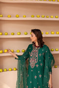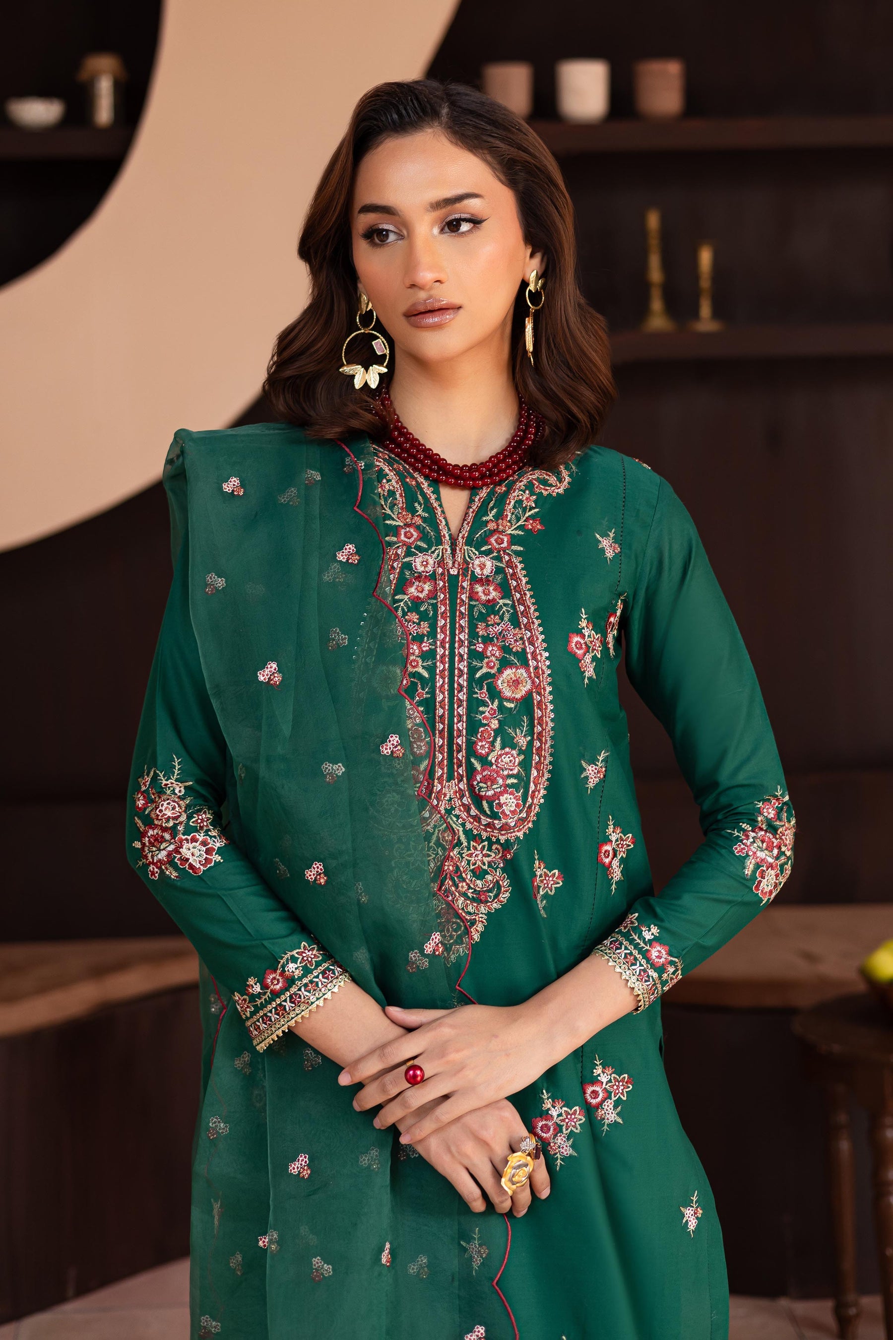 This elegant ensemble features a long pima lawn shirt with a composed neckline and all-over embroidery, exuding timeless sophistication. Organza borders with delicate lace finish the sleeves and hem, while embroidered motifs on the fitted sleeves add a refined touch.