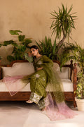 The look is completed with a tie-dyed net dupatta, embellished with an embroidery spread and d