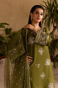 This mehndi green pima lawn short shirt is adorned with a rich embroidery spread, beautifully balanced by intricate detailing along the neckline, creating a refined focal point. The sleeves are framed with heavily embroidered borders, finished with delicate lace that adds a feminine and elegant touch.