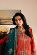 This open-front pima lawn short shirt in deep rust colour features an intricate embroidered neckline and a composed hem with a border. The sleeves are elegantly finished with lace and an embroidered spread for added detail.