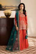 The ensemble is completed with a contrast organza dupatta, adorned with all-over spread embroidery and finished with lace and a border on all four sides, adding a perfect finishing touch.