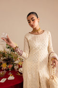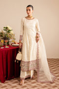 This front open pima lawn frock is designed with a beautiful embroidered jal and features a colorful direct adda at the neckline on a off white canvas for a vibrant touch. The hem is finished with an embroidered organza border, while the sleeves are also jal-embroidered, with a properly finished border at the hem.