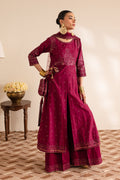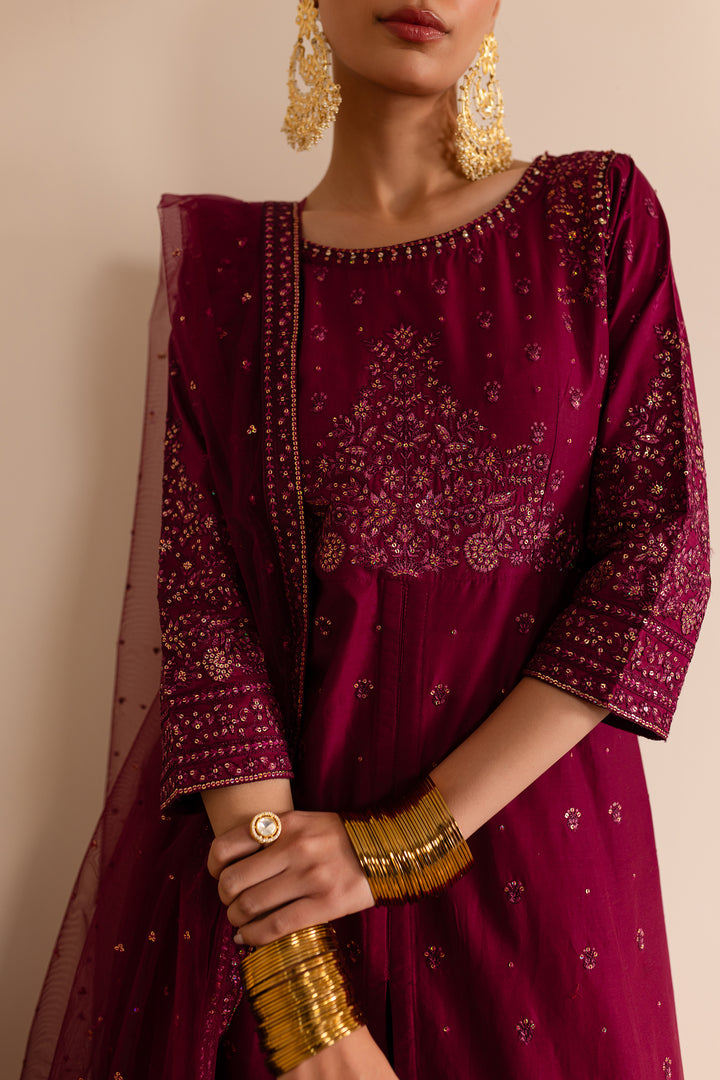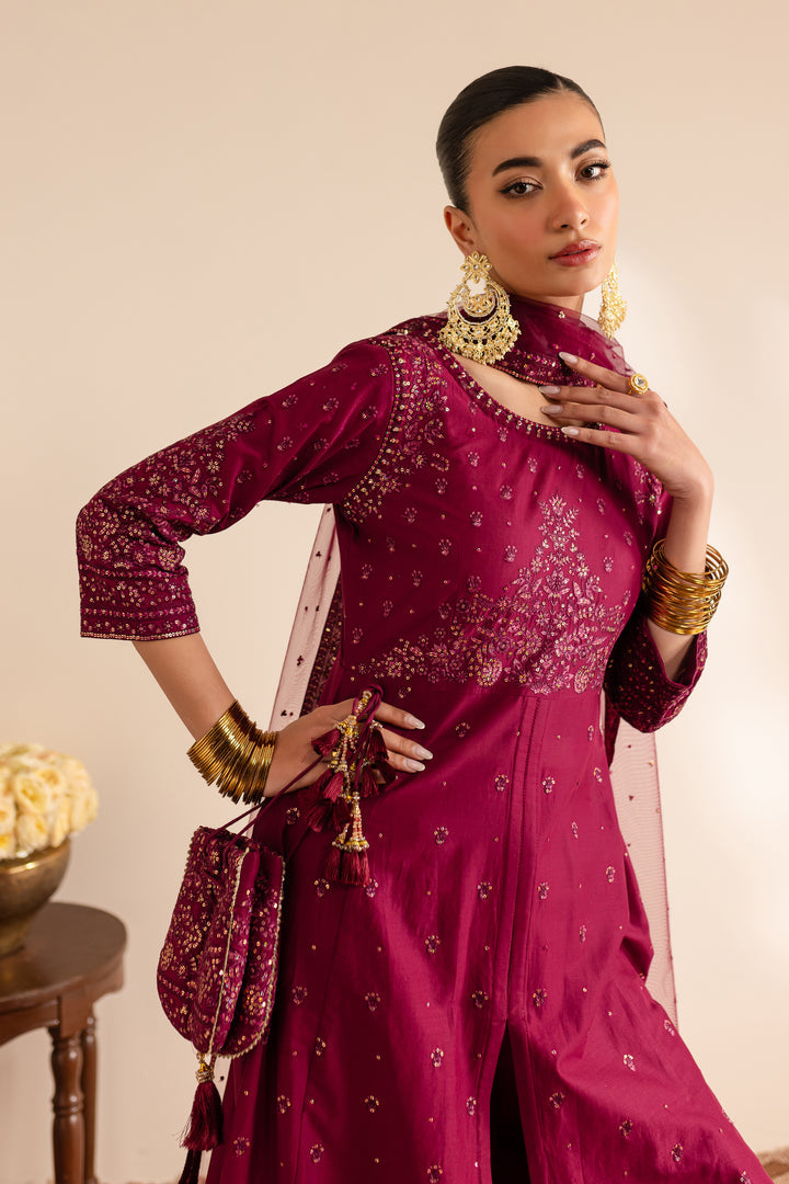 This mulberry Pima lawn front slit frock features an embroidered yoke with intricate floral detailing and adda work on the neckline. The fitted quarter-length sleeves are embroidered and embellished with multicolored sequins. The frock is adorned with spread embroidery and a detailed embroidered border at the hem.