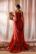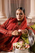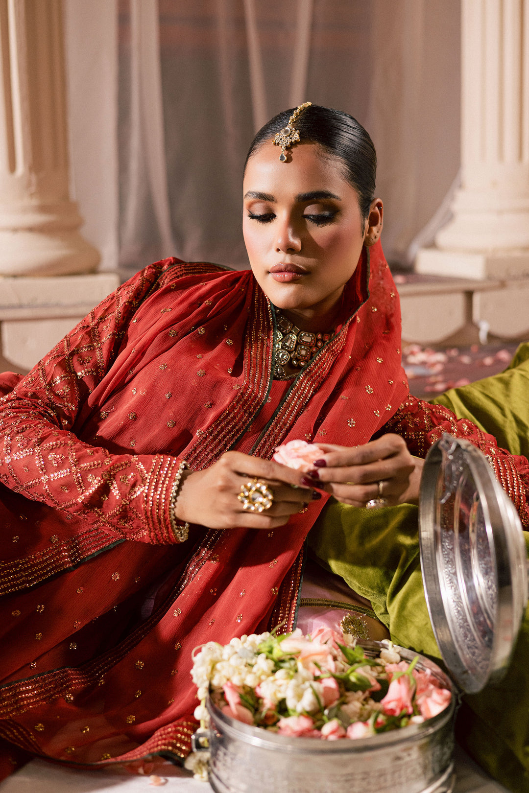This 3-piece outfit blends rich craftsmanship with a touch of understated charm. The embroidered frock features direct adda work at the neckline, adding a refined hint of shimmer. The crinkle sleeves are embroidered and finished with a bordered hem and snap button detailing, while the frock’s flare is panelled and embroidered with samosa lace and contrast borders that bring depth and texture to the design.