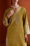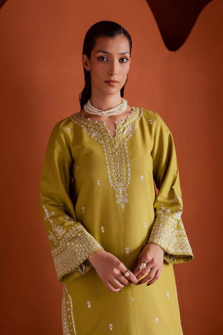 Make a statement with this chic Dazy two-piece set, featuring a short pear green khaddar shirt adorned with geometric embroidery enhanced by sequin detailing for a subtle shimmer. The neckline is embellished with delicate pearl accents, adding a touch of elegance to the contemporary design.Both the sleeves and shirt hem are finished with minimal lace, keeping the look clean and refined.