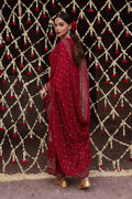 The look is completed by a beautifully embroidered chiffon dupatta, perfectly balancing the rich textures for a stunning festive ensemble.