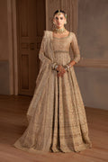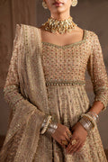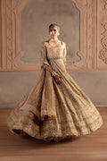 The ensemble is crowned with a delicate net dupatta, fully embroidered in an intricate jaal pattern. Its beauty is framed with organza borders on all four sides, further enhanced with material embellishments that add depth and luxury. Draped softly, this dupatta envelopes the bride in an ethereal glow, completing the look with a radiant touch of grandeur.