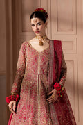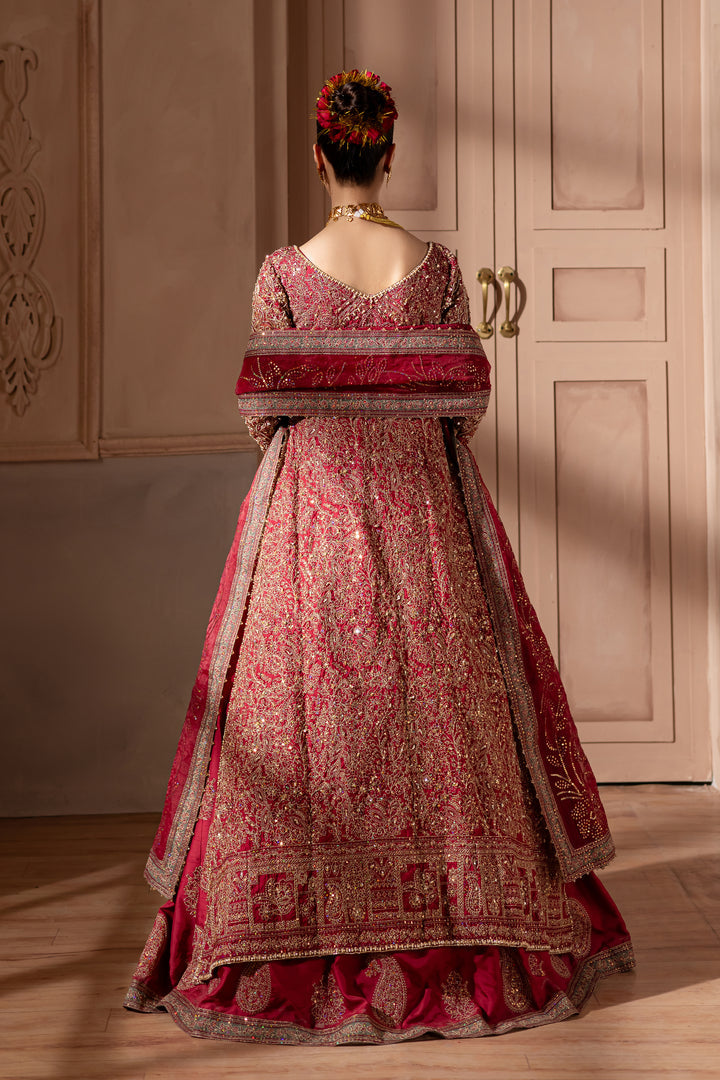 A breathtaking organza dupatta completes the look, lavishly embroidered with sequins to cast a soft, luminous sheen. Its borders are finished in contrasting tones and further embellished on all four sides to elevate its elegance. Draped effortlessly, this dupatta surrounds the bride in an aura of royalty and magnificence, making the entire ensemble a true statement of luxury.