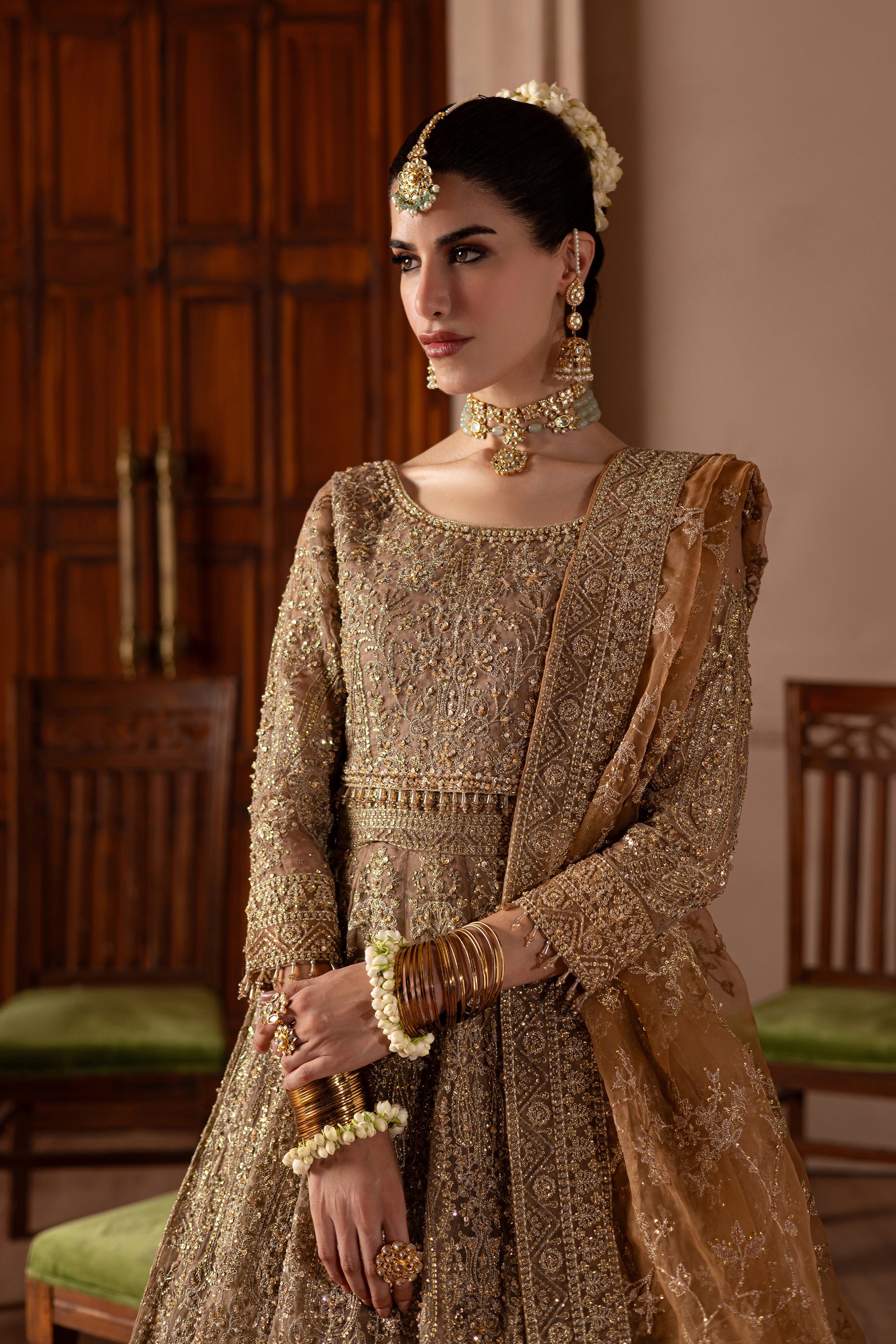 A contrasting rust dupatta completes the attire, embroidered in an elegant jaal pattern that exudes timeless grace. Its borders are delicately finished, while embellished hangings along the edges add a touch of tradition and splendor. Draped effortlessly, the dupatta balances the ensemble with sophistication and grandeur.