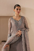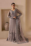 This 3-piece ensemble captures the essence of ethereal sophistication with its steel grey embroidered chiffon shirt. The design is elevated with crystal embellishments gracing the neckline, side chaks, sleeve hems, and shirt hem, creating a subtle play of light and texture. The sleeves are finished with delicately embroidered organza borders, adding a graceful touch to the overall silhouette.