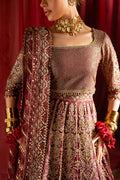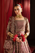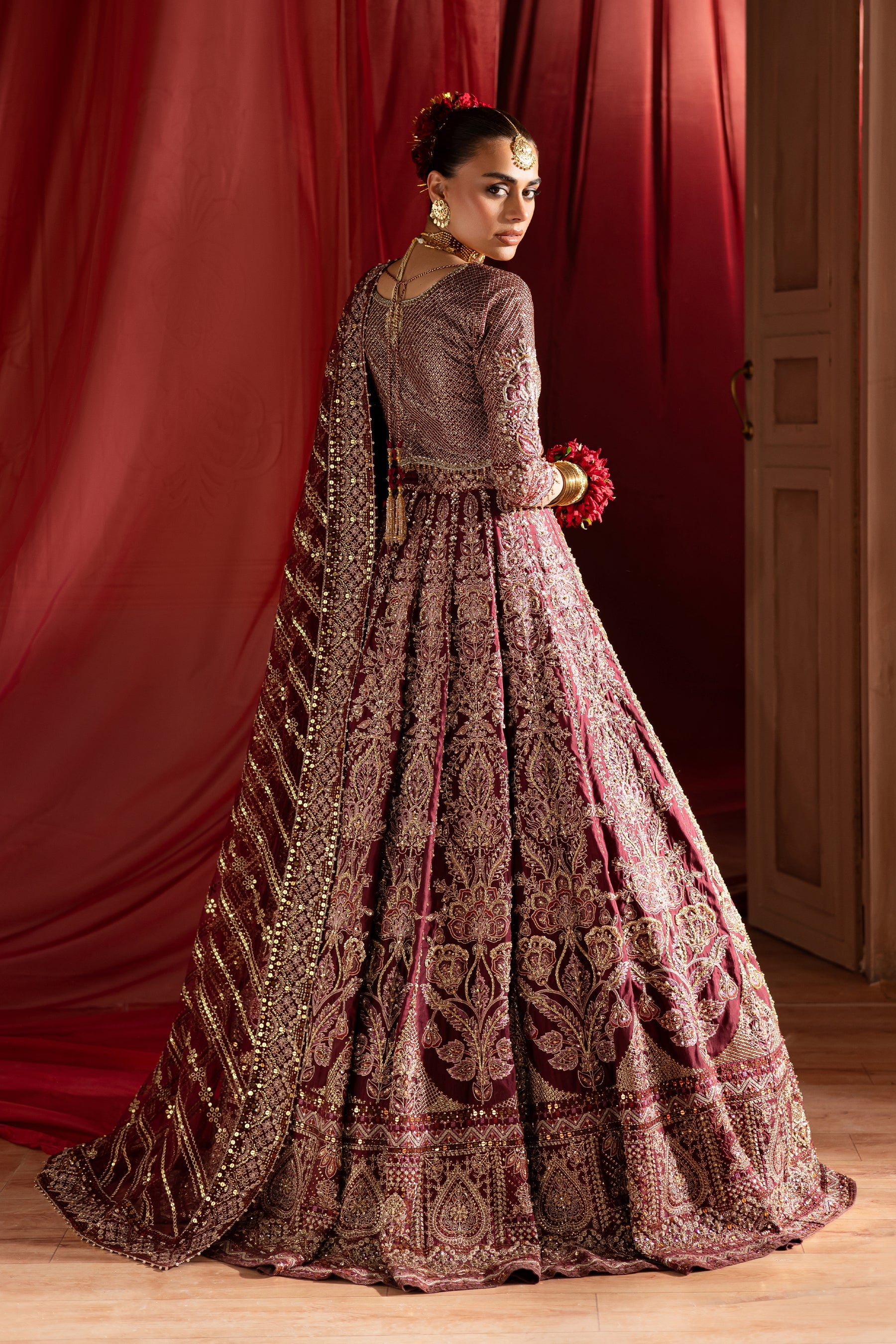 The look is completed with a delicate net dupatta, intricately embroidered and bordered with organza finishing. Material embellishments along all four sides lend depth and brilliance, creating an ethereal drape that surrounds the bride in timeless grace.