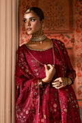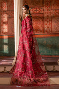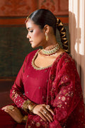 This 3-piece ensemble highlights intricate detailing and rich craftsmanship. The crinkle frock features an embroidered yoke with delicate adda work on the neckline, while the paneled design carries an allover embroidered spread finished with an elegant organza border at the hem. The crinkle sleeves mirror this artistry, detailed with an embroidered jaal border and samosa edging for a cohesive, handcrafted look.