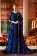 This 3-piece outfit embodies soft sophistication in serene blue chiffon. The frock features a slightly V-shaped embroidered neckline adorned with adda work for a subtle shimmer. The sleeves are heavily embroidered, while the flare carries embroidered motifs and sequins with a refined border along the hem. Both the sleeves and frock hem are finished with samosa lace for a polished touch.
