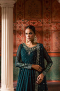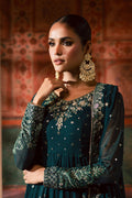 This 3-piece outfit radiates classic elegance in rich emerald chiffon. The frock features a slightly V-shaped embroidered neckline adorned with adda work, adding a refined sparkle to the design. The sleeves are delicately embroidered, while the flare carries a sequin-embellished spread and a bordered hem. Both the sleeves and frock hem are finished with samosa lace, giving the outfit a graceful and polished edge.