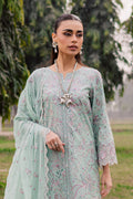 This three-piece Pima lawn Eid ensemble features a front-open fully composed embroidered shirt with sleeves, detailed with embroidered organza borders along the sleeves and hem. The silhouette is enhanced with delicate lace embellishments, creating a refined festive statement perfect for Eid celebrations.