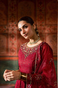 This 3-piece outfit exudes timeless elegance in red net. The frock features an embroidered yoke with a boat-shaped neckline, accentuated by delicate adda work. The sleeves carry embroidered motifs and bordered hems, while the flare showcases an embroidery spread with a refined border along the frock hem.