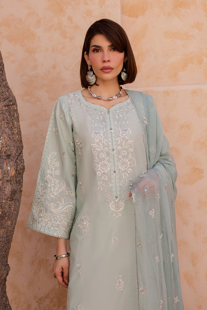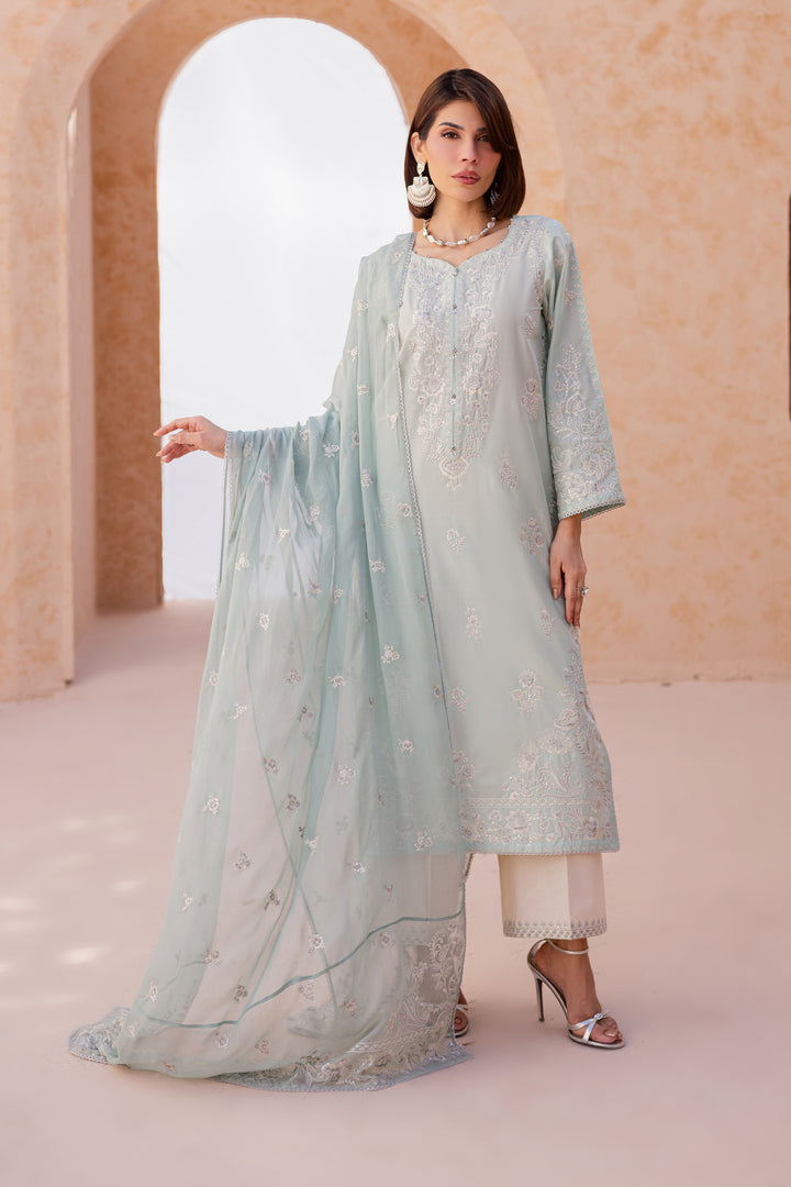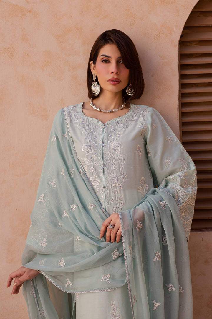A matching crinkle embroidered dupatta in self-tone completes the ensemble, introducing textured elegance and graceful movement.