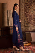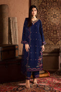This elegant three piece ensemble features a long georgette shirt with a composed embroidered hem and a delicately hand worked neckline. The front is adorned with detailed embroidery spread, adding subtle depth and texture. The flared sleeves carry matching embroidery on the hem and spread, completing the design with soft refinement.