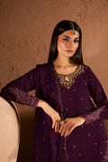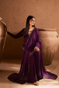 This dark plum ensemble features a short shirt and flared sharara that exude classic glamour. The shirt’s round hem carries composed embroidery in monotones and gold, while the keyhole neckline is adorned with heavy adda and hand worked detailing across the front. The sleeves feature composed embroidery on the hem and spread, adding depth to the design.