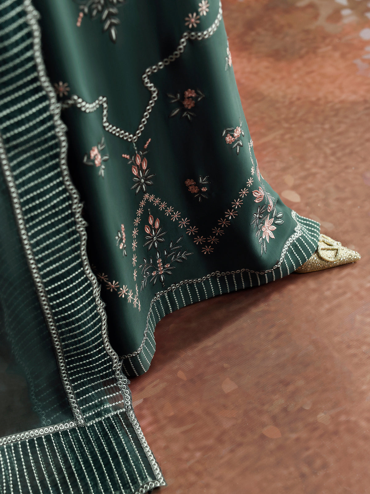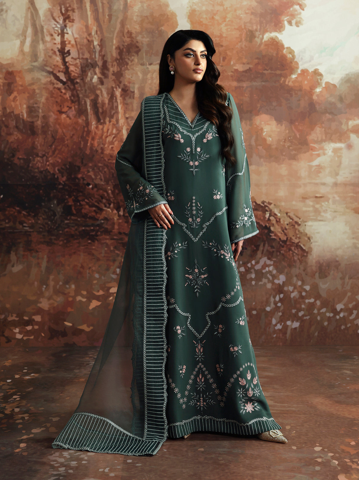This elegant shirt features a sophisticated grey base, beautifully enhanced by delicate pink embroidery in floral and geometrics. Paired with a sheer organza dupatta that shimmers softly, the ensemble strikes a perfect balance of timeless elegance and graceful charm.