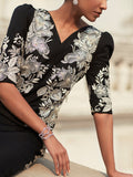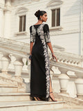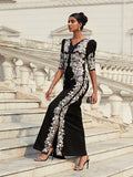 Introducing "Amora," a masterpiece of design that will leave you feeling utterly radiant. This captivating black dress, crafted from luxurious grip fabric, is adorned with whimsical white pastoral embroidery, creating a mesmerizing play of light and shadow. The flattering silhouette, accentuated by puffed sleeves and a captivating neckline, exudes a sense of effortless sophistication.