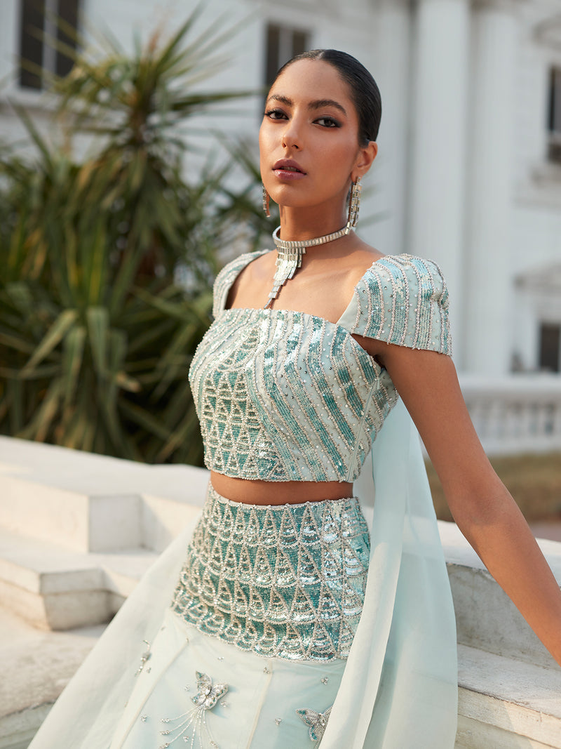 The lehenga, adorned with opulent sequin ripples, stone detailing, and exquisite hand-made butterfly motifs, is a vision to behold. The addition of frills at the end adds a playful touch, while the stylish organza dupatta completes this breathtaking look.