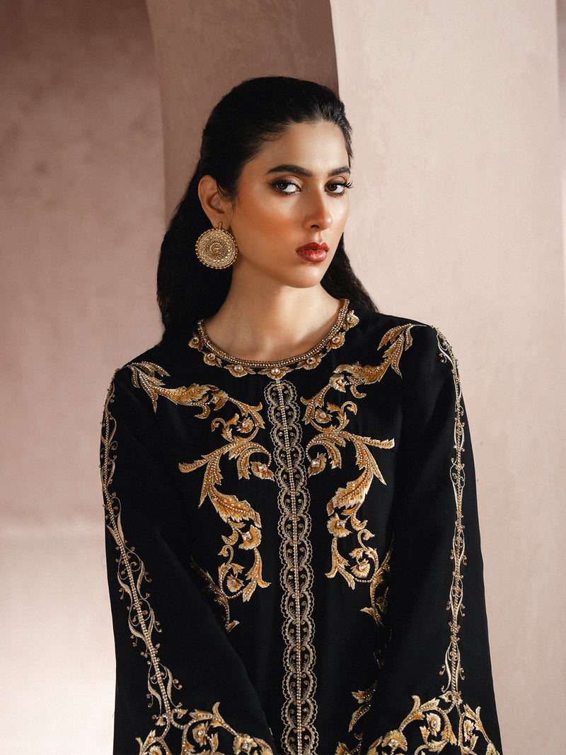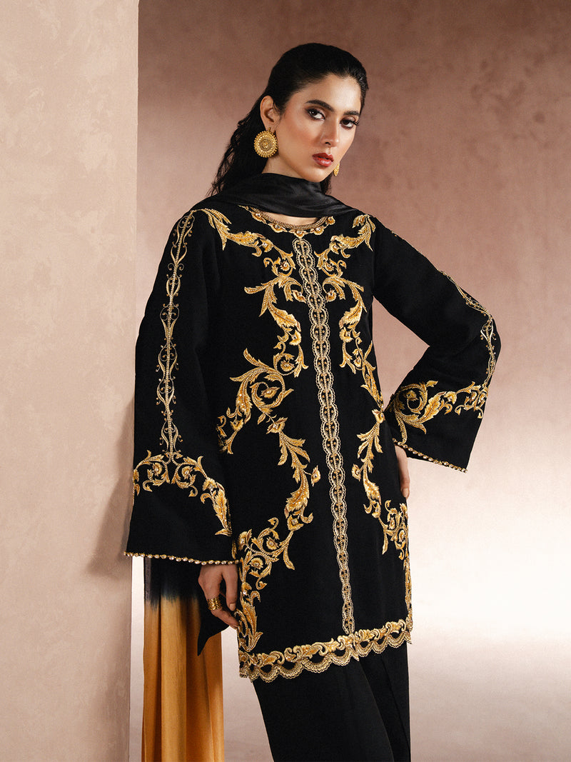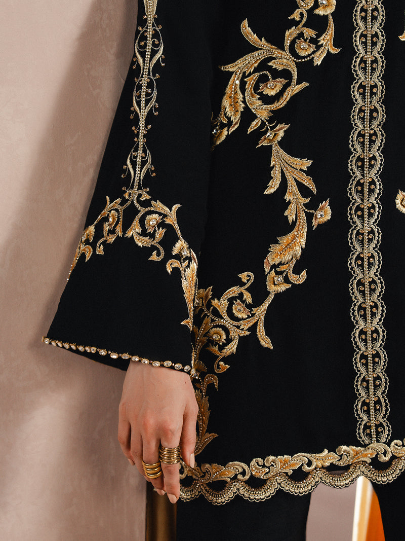 Entrancing motifs and harmonious colors come together to create a captivating, sleek silhouette — meticulously hand-embroidered chiffon shirt and adorned with stones, chains, and crystals for a striking finish, raw silk trouser and flowy medium silk dupatta.