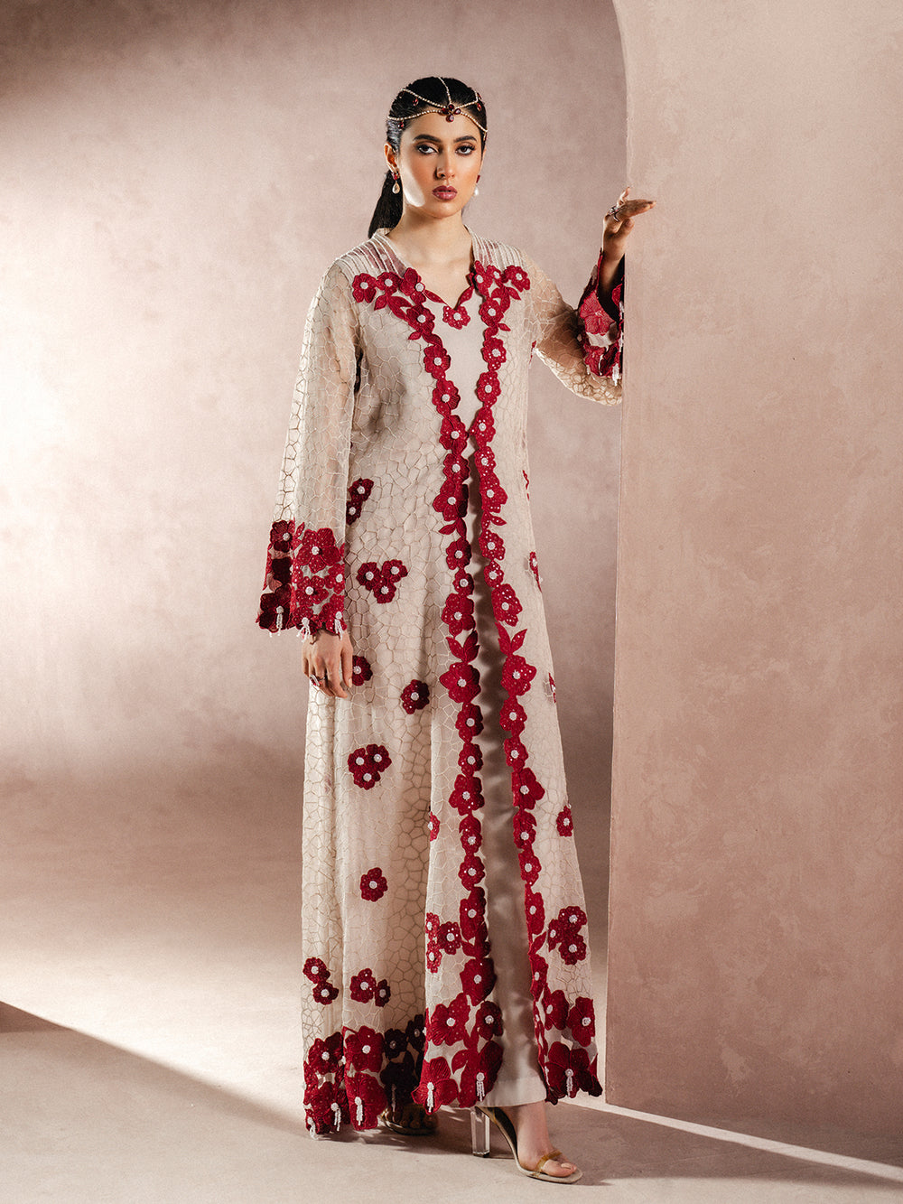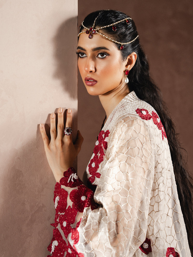 This gown is a true statement of elegance and modesty, featuring a delicate organza overlay paired with a chiffon inner. Intricate patchwork and hand embellishments of crystals and pearls add a touch of timeless grace.