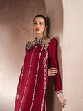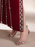 This design exudes contemporary elegance, elevated by meticulous linear placements of shimmering stones on raw silk with flowy medium silk dupatta, catching the light with every step and adding a touch of modern glamour to the ensemble.