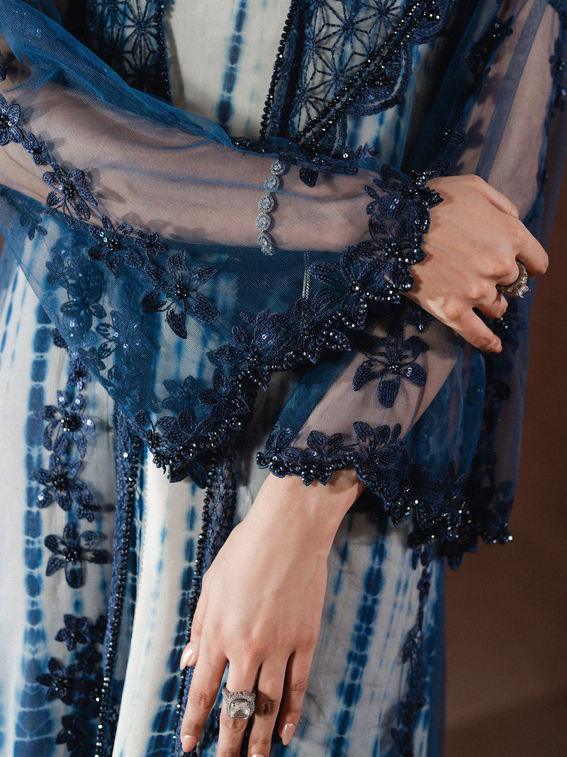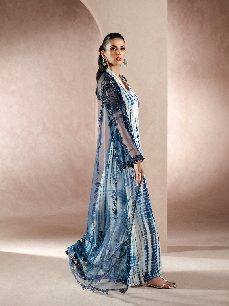 Wrapped in a gossamer layer of blue net adorned with shimmering crystals, the dress reveals a tie-dyed column of sleek chiffon dress beneath, the cascade of color and texture that catches the light with every graceful movement.