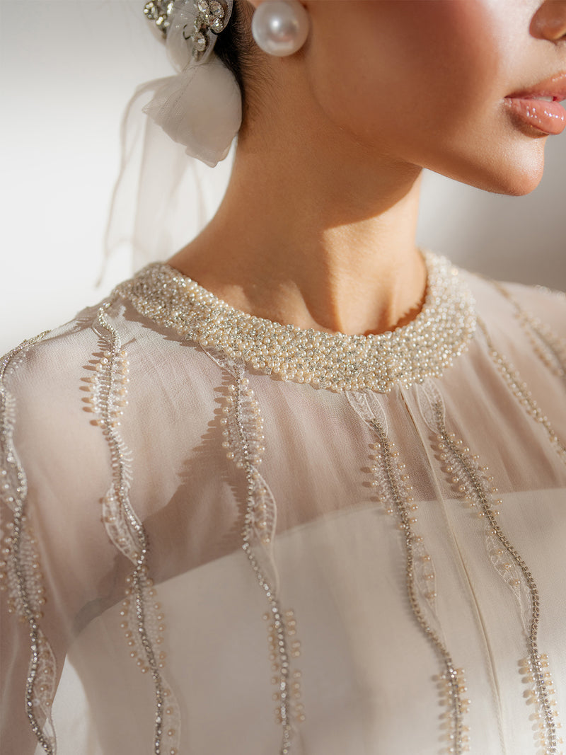 The Sadie-white outfit is intricately embroidered and embellished with shimmering crystals and delicate chains, transforming this chiffon cape into a statement piece. A lavishly embellished neckline elevates its allure, making it a symbol of sophistication.