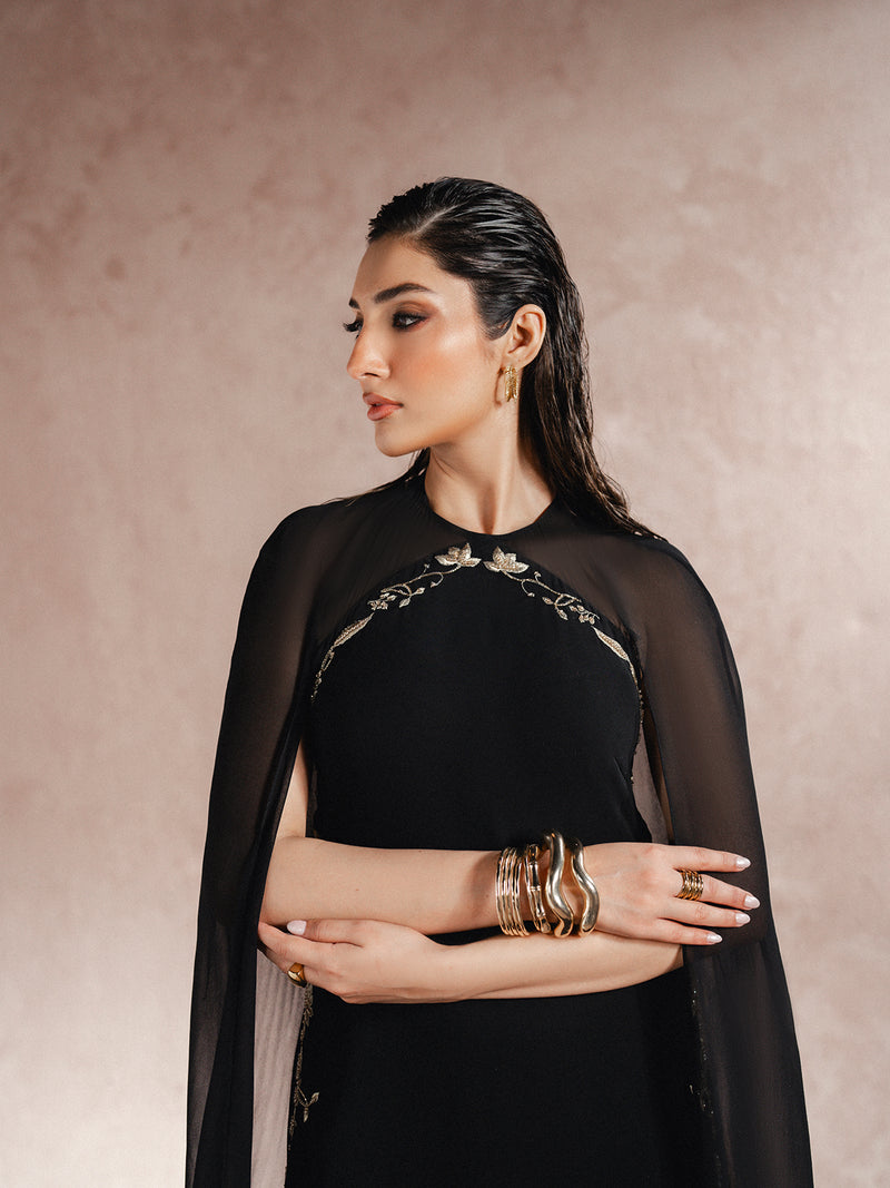 Void, a sleek black dress with a flowing chiffon cape, delicately attached and adorned with intricate gold hand embroidery and shimmering crystals is truly a captivating illusion of movement and refined artistry.