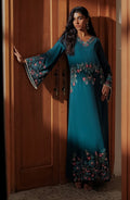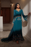 The dress seamlessly blends floral artistry with a contemporary cutline, exquisitely hand-embroidered on chiffon in symphony of vibrant colors, paired with a delicate organza dupatta which exudes timeless elegance.