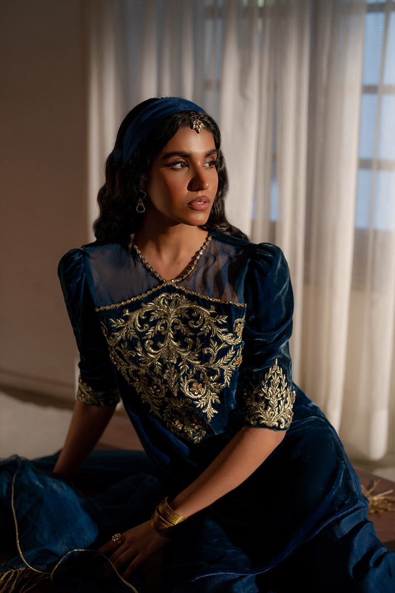 The shirt fabric is velvet, trouser raw silk and dupatta net. the outfit is hand embroideredin gold tilla and hand embellishment of dabka and crystals.