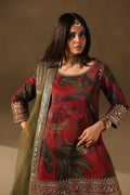 Crafted on a rich, deep wine base, the shirt features oversized botanical motifs in muted sage and crimson tones, framed with intricate tilla, resham, and antique Tilla work inspired borders.