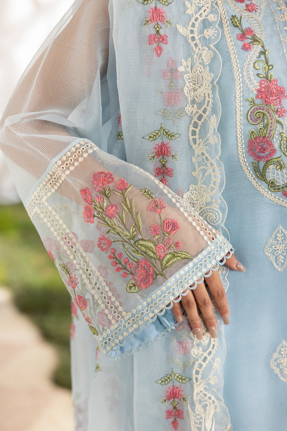 A serene powder blue ensemble crafted in a cotton net shirt delicately lined with silk, beautifully adorned with intricate pastel floral embroidery and fine lace detailing along the neckline, sleeves, borders, and hem for a soft finish. Paired with a flowing dupatta, enriched with embroidered floral motifs and scalloped lace edging, creating an airy and graceful drape. The look is completed with a refined silk shalwar with embroidery, adding fluidity, structure, and elegant movement to the silhouette.